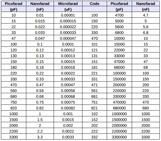 Таблица преобразования емкости очень полезна, потому что разные производители электронных компонентов могут маркировать компоненты по-разному, иногда маркируя их как несколько нанофарад, тогда как другие производители могут маркировать свои эквивалентные конденсаторы как доли микрофарад и так далее. Очевидно, что дистрибьюторы электронных компонентов и магазины электронных компонентов будут использовать номенклатуру производителей.
